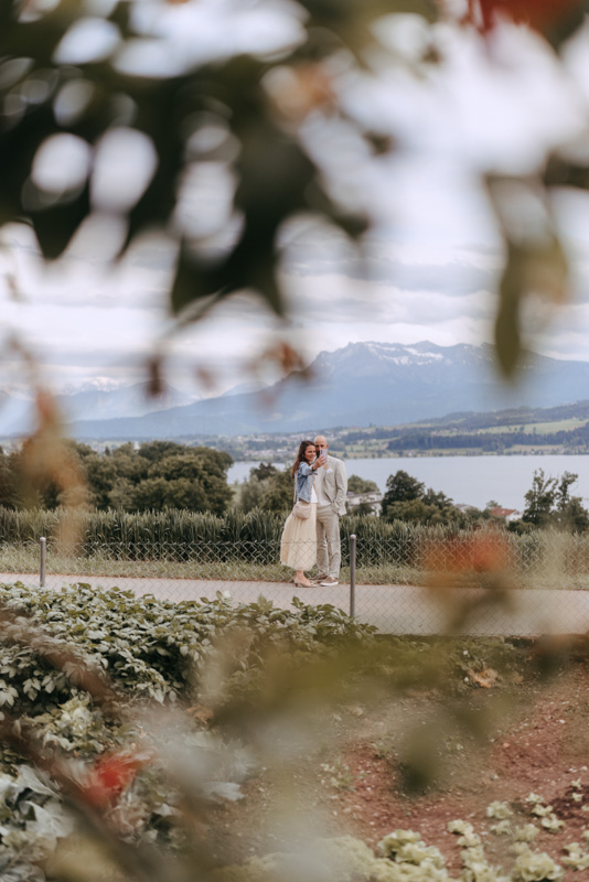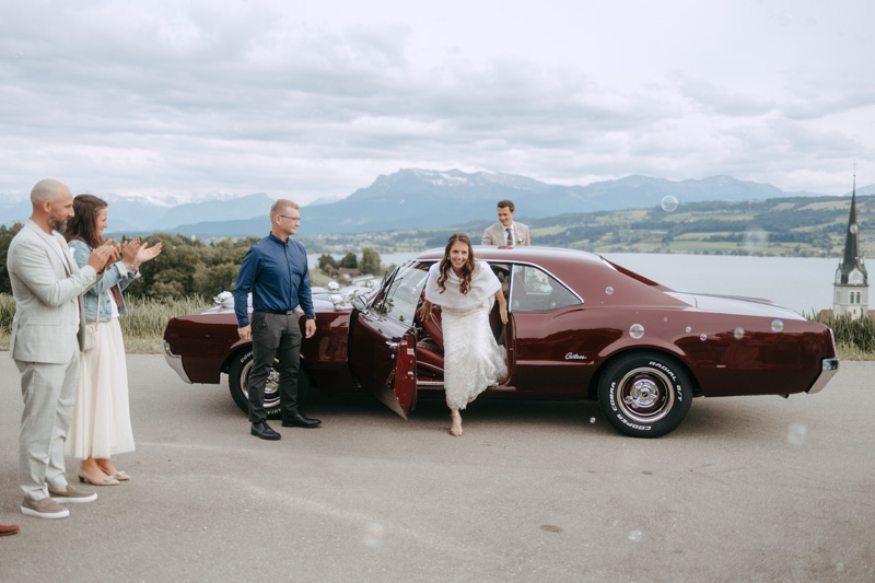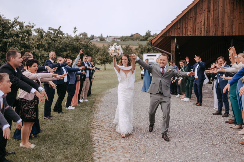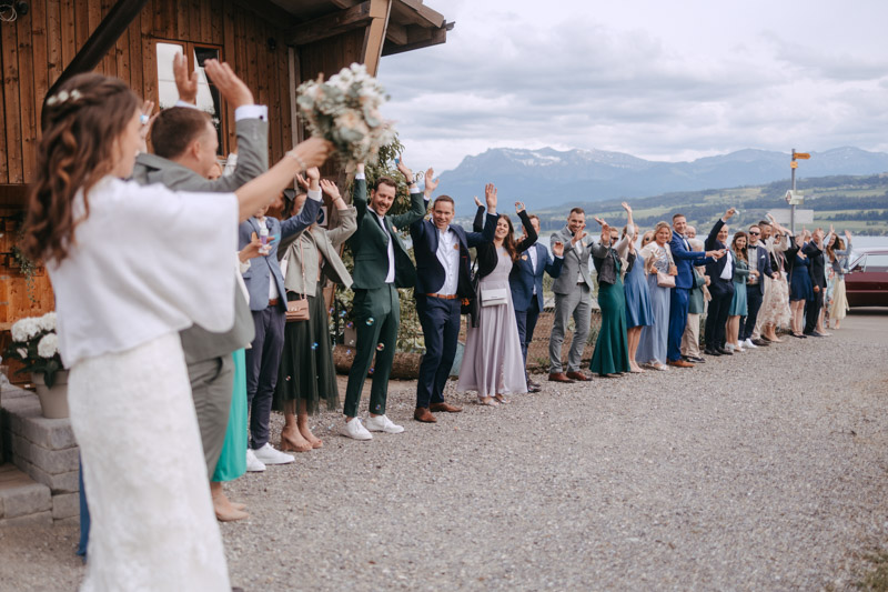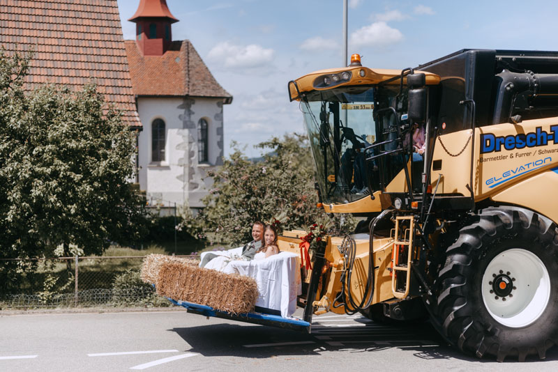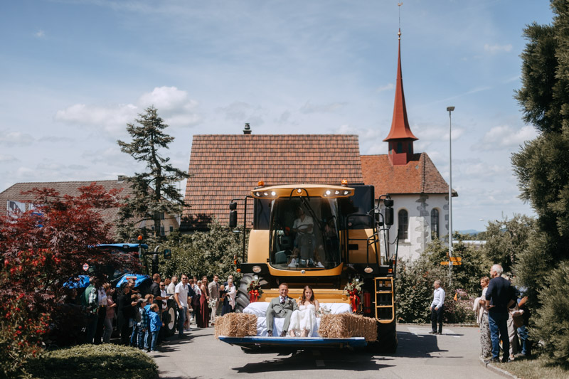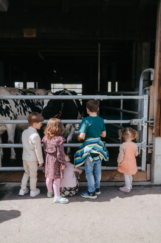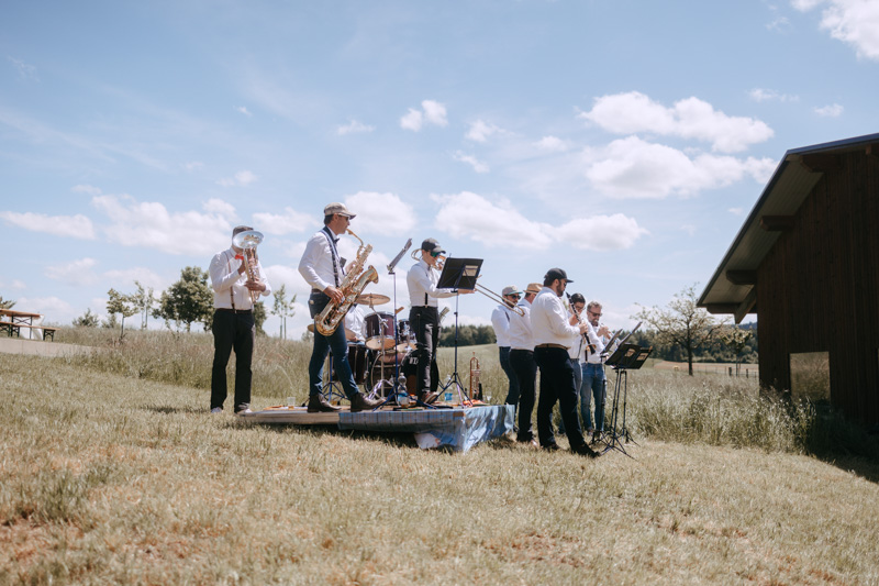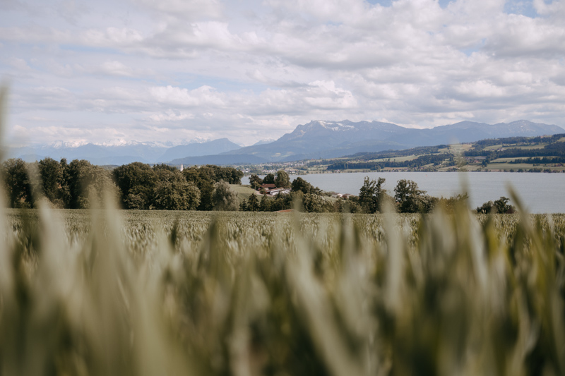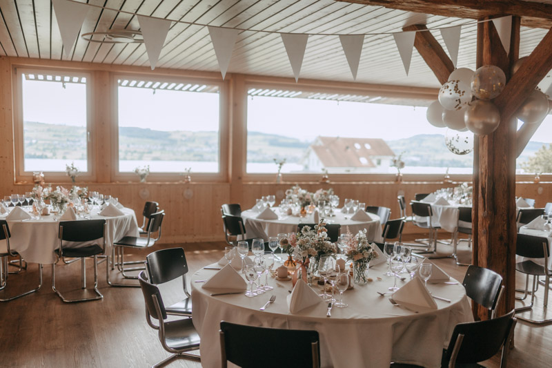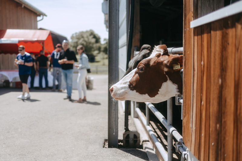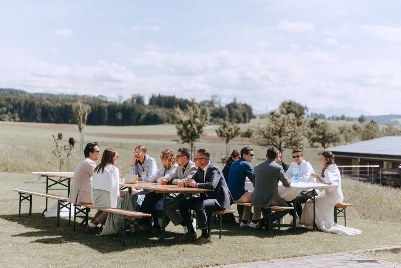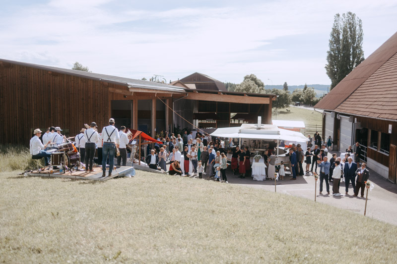 Nach dem First Look und der kirchlichen Trauung fand der Apéro beim Brautpaar auf dem Hof statt. Eine grosse Anzahl gut gelaunter Gäste, bestes Wetter, tolle Livemusik und Kühe mittendrin – was will man mehr. 🙂 Anschliessend feierte die Gesellschaft im wunderschönen Brunhof weiter, die Deko und der Ausblick waren das i-Tüpfelchen eines traumhaften Tages.
