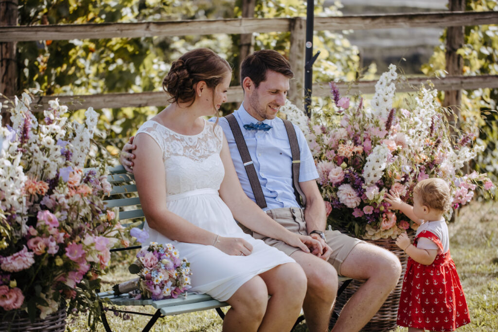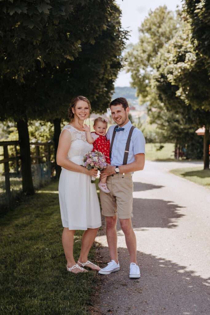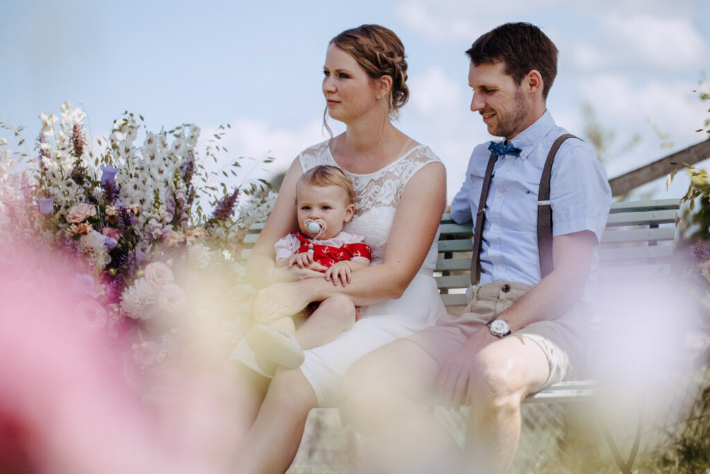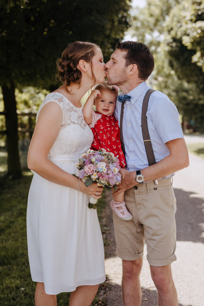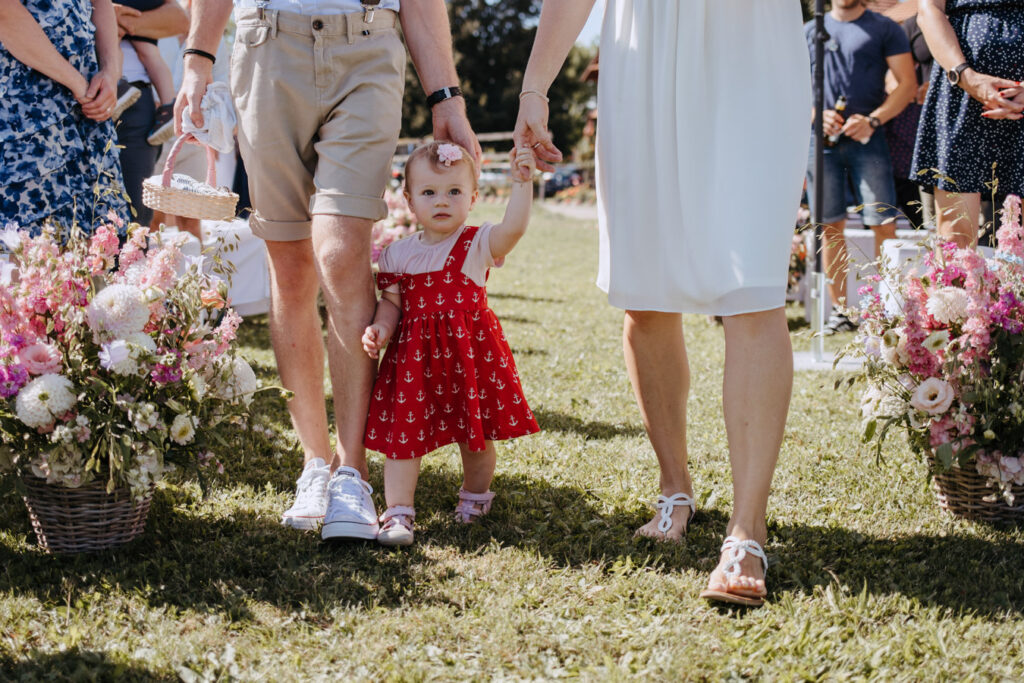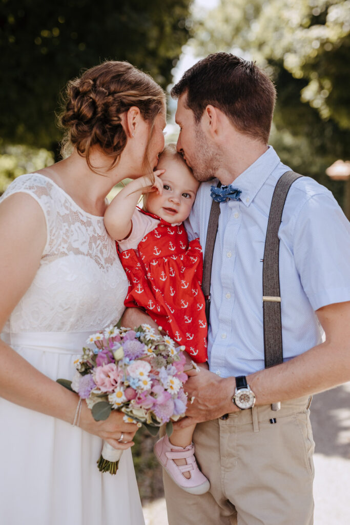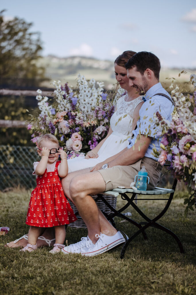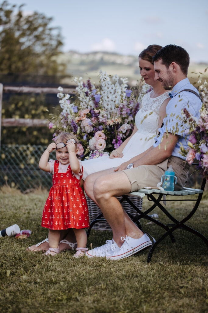 Denise und Pascal durfte ich bereits während der Schwangerschaft und zusammen mit ihrer Tochter fotografieren, sodass ich mich umso mehr auf ihre Trauung beim Lindenhof in Oberkirch gefreut habe. Wie man an den Bildern unschwer erkenne kann, zog sich das Thema „Anker“ durch die ganze Hochzeit der beiden. Sie haben ihren grossen Tag mit viel Liebe zum Detail gestaltet, was mich als Fotografin immer besonders freut. Auch die unkomplizierte Art der beiden spiegelte sich an ihrer Hochzeit wieder, nicht nur die Trauung konnte bei strahlendem Sonnenschein im Freien stattfinden sogar das Abendessen inkl. Food Truck, Glacévelo und Bar. Aber sie hatten nicht nur Wetter- sondern auch Familienglück, verrieten sie doch während der Trauung, dass ihr kleine Tochter bald grosse Schwester wird. Ich freue mich sehr, dass ich vom weiteren Nachwuchs ebenfalls Fotos machen darf.
